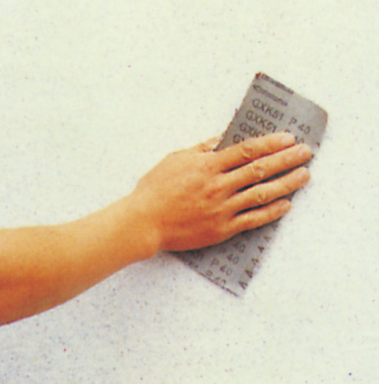 在噴真石漆面漆前將真石漆表面有銳角之顆粒磨平約30-50%,可增加真石美感及減少銳利并避免灰塵漬留。